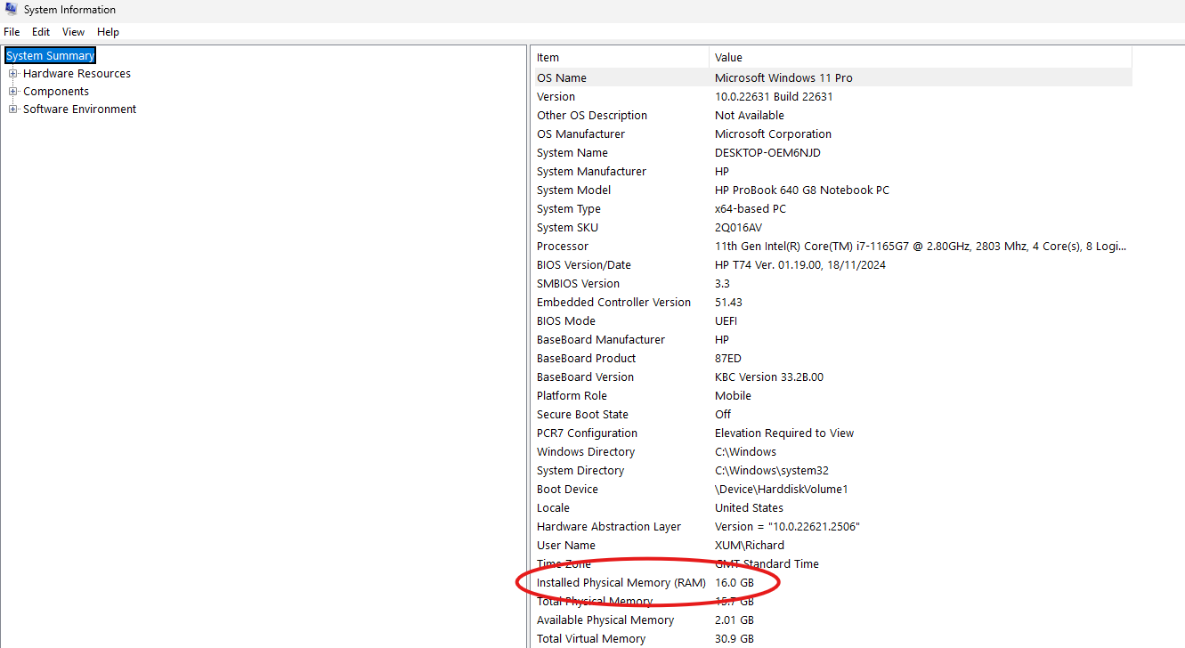 - In the left pane, navigate to System Summary. On the right side, complete details about your installed memory, including the total installed physical memory (RAM).