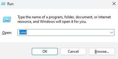 - Open Command Prompt by pressing the Windows key + R and typing cmd into the search bar.