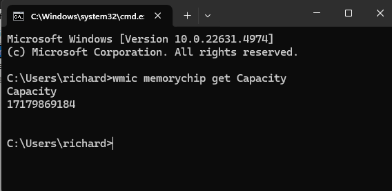- Type the following command: In the Command Prompt window, wmic memorychip get Capacity Press Enter. This command will show the capacity of each memory module in kilobytes (KB).