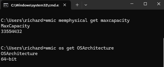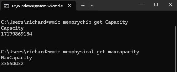 - In the command prompt, type wmic memphysical get maxcapacity, then press Enter.