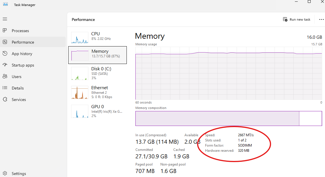 - Look for the Slots Used field under the Memory section. This indicates the number of memory slots currently in use.